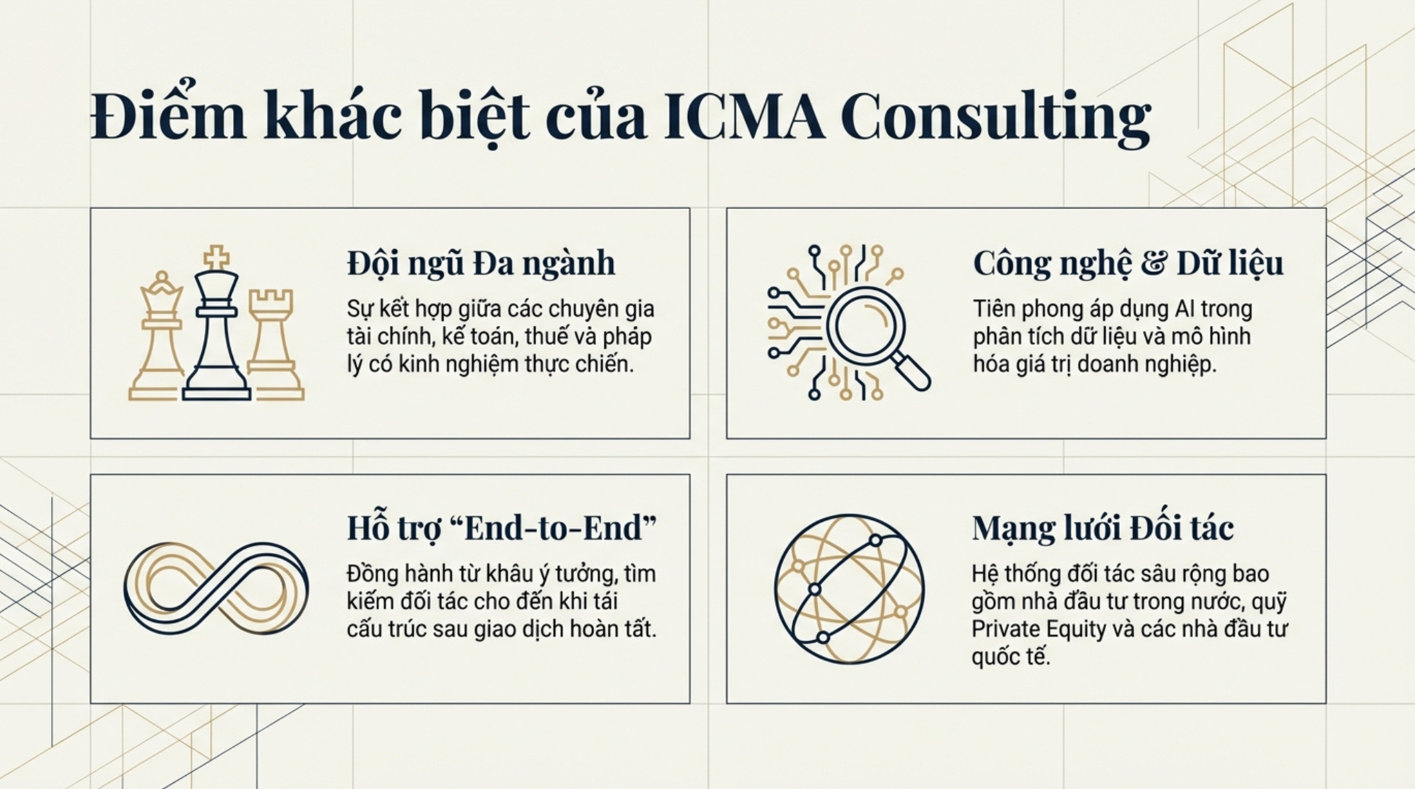 Các điểm khác biệt chính của ICMA là đội ngũ chuyên gia đa lĩnh vực (tài chính, kế toán, thuế, pháp lý), mạng lưới đối tác và nhà đầu tư trong và ngoài nước, việc ứng dụng AI vào phân tích dữ liệu, và kinh nghiệm thực tiễn qua các thương vụ thành công có giá trị trên 10 triệu USD.