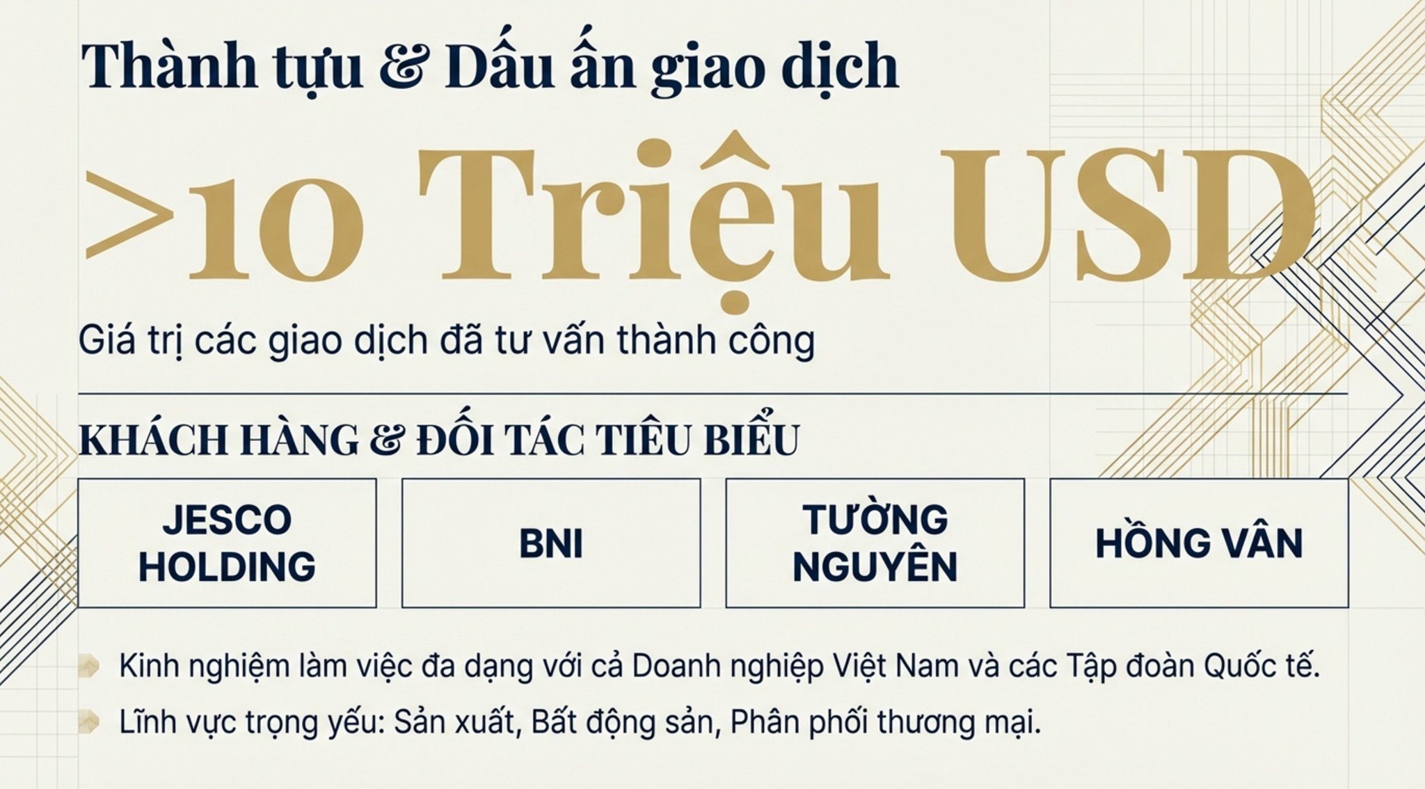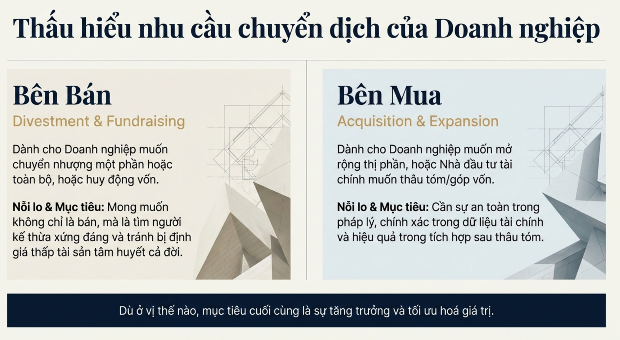 - Triển khai và quản lý toàn bộ quy trình M&A, từ khâu chuẩn bị đến giai đoạn hậu giao dịch.
