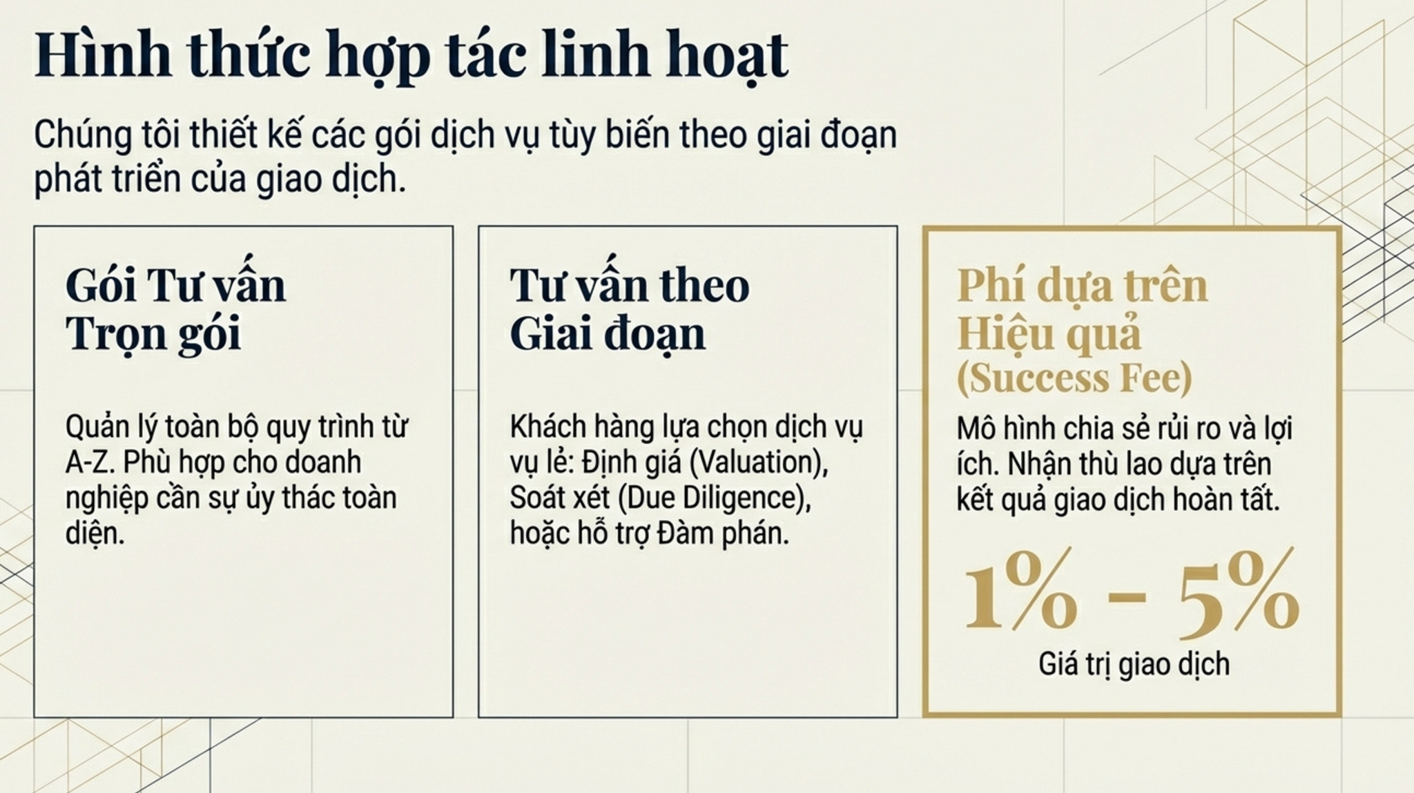 Mô hình hợp tác của công ty rất linh hoạt, bao gồm các gói dịch vụ trọn gói, tư vấn theo từng giai đoạn cụ thể, hoặc tính phí dựa trên thành công của giao dịch với mức thù lao từ 1% đến 5% giá trị thương vụ.