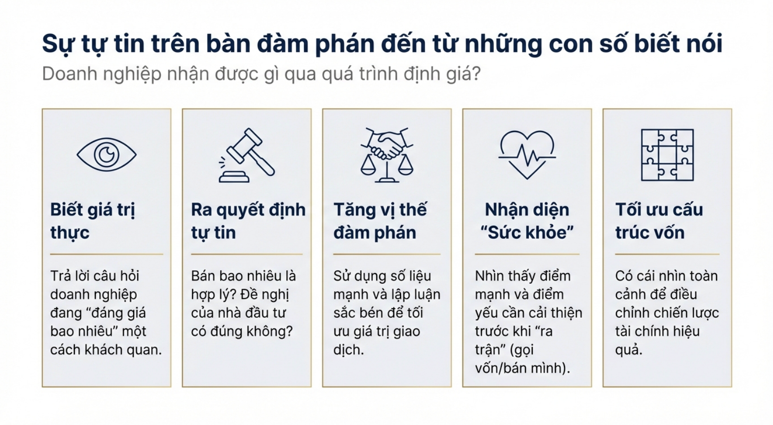 Dịch vụ Định giá doanh nghiệp là quá trình xác định giá trị kinh tế thực sự của doanh nghiệp dựa trên dữ liệu tài chính, mô hình kinh doanh, tài sản, tiềm năng tăng trưởng và rủi ro.